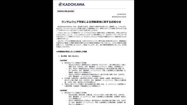 KADOKAWA 個人情報漏えい約25万件?